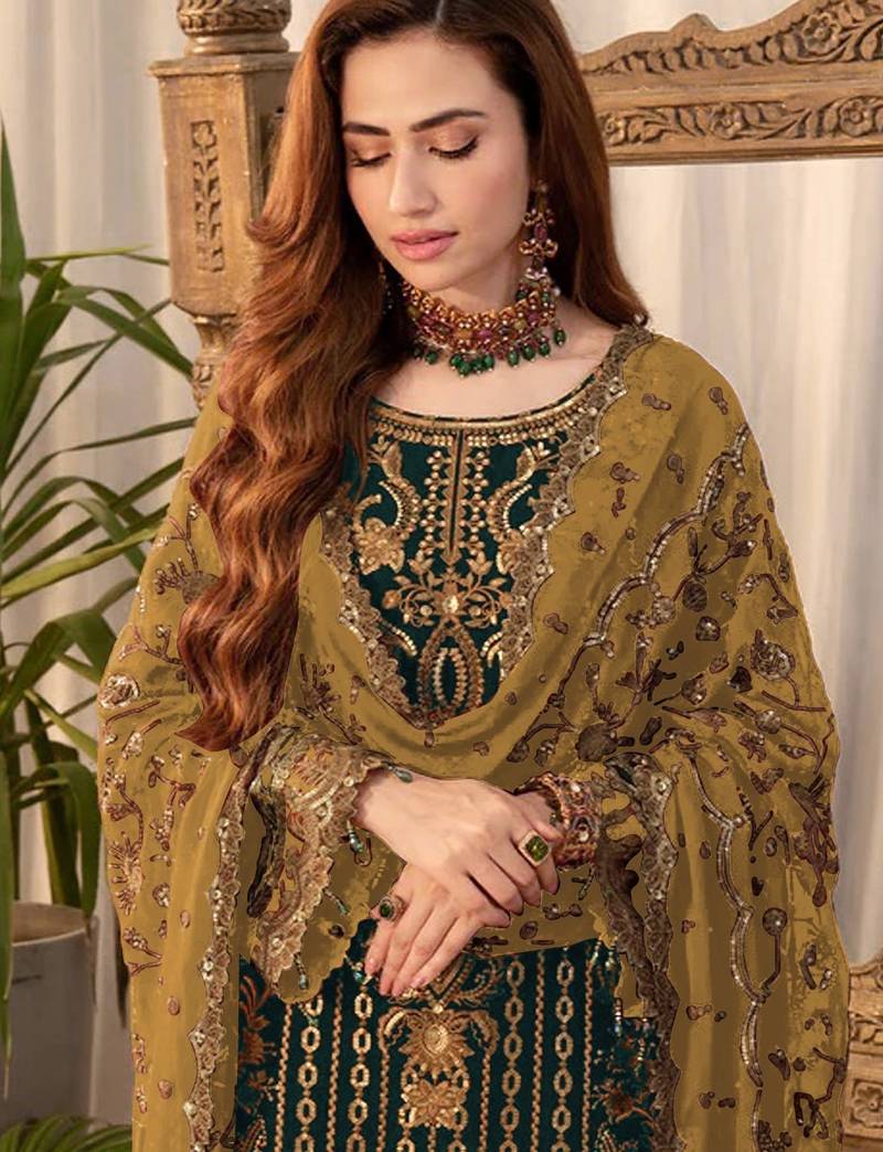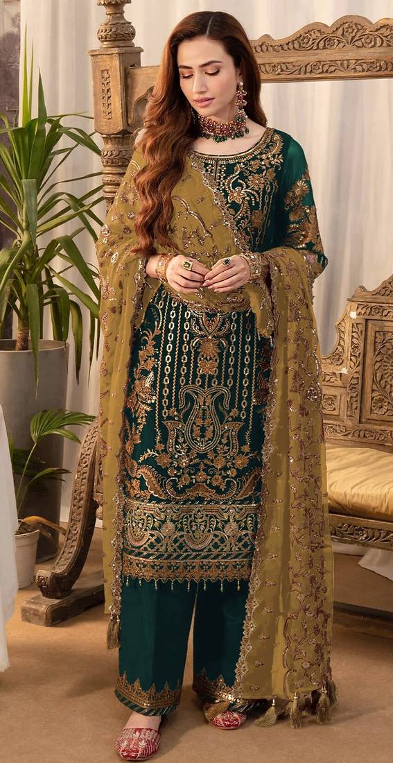 Dark green embroderied silk palazzo suit semi stitched