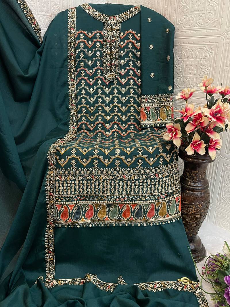 | Product Name | Dark Green Premium Embroidered Chinon Semi Stitched Salwar Suit | |