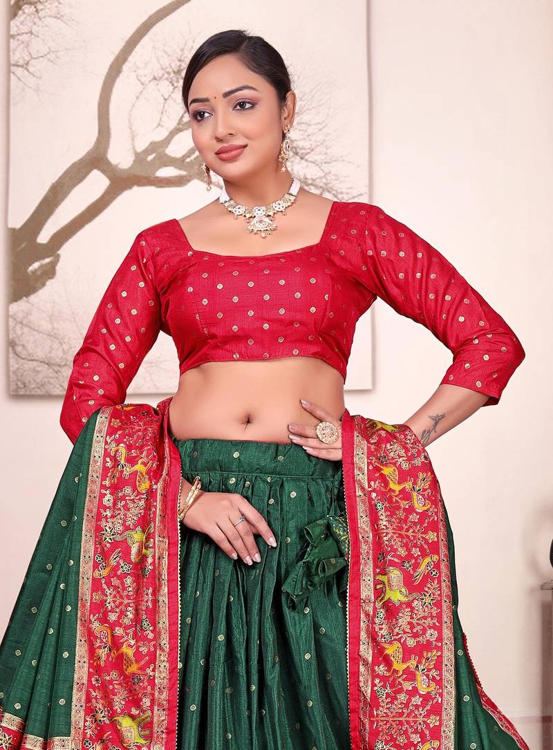 Green patola print dola silk semi stitched lehenga choli with tassels
