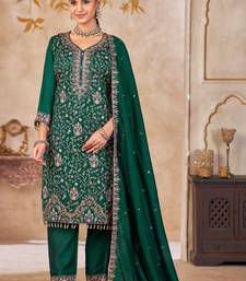 Green vichitra silk readymade suit with embroidery & lace work stitched