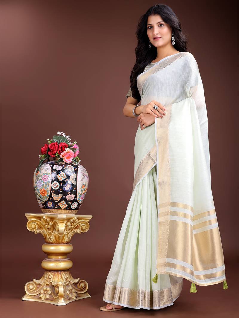 | Product Name | Light Green Cotton With Golden Border And Zari Weaving Saree With Blouse | |