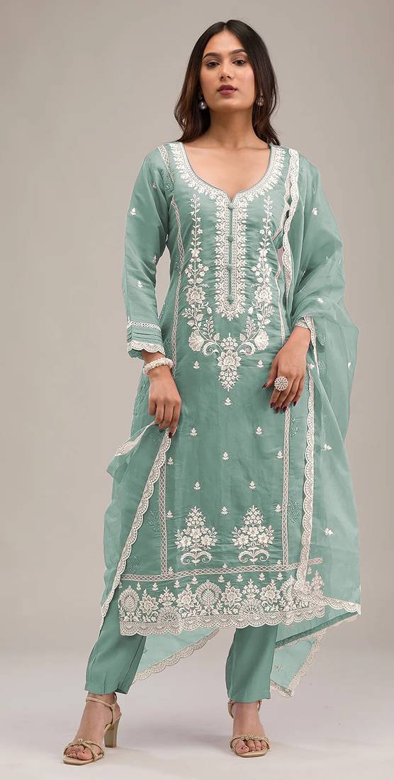 Light-green embroderied silk salwar suit semi stitched