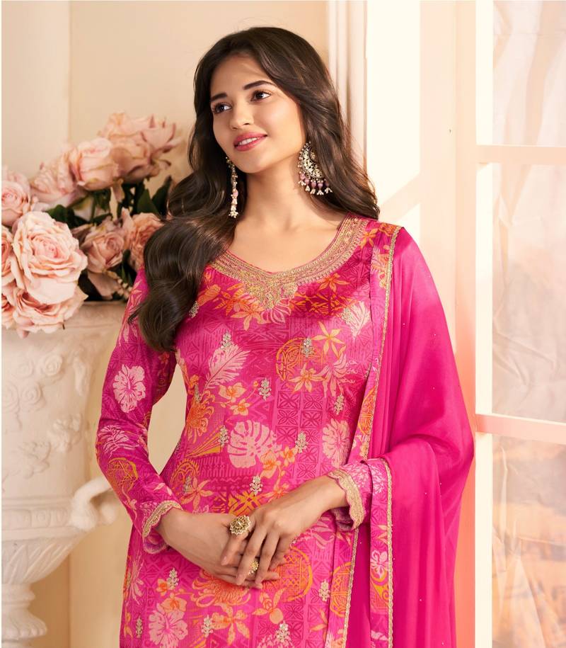 | Product Name | Magenta Chinon Semi Stitched Suit With Multi Digital Printed Work | |
