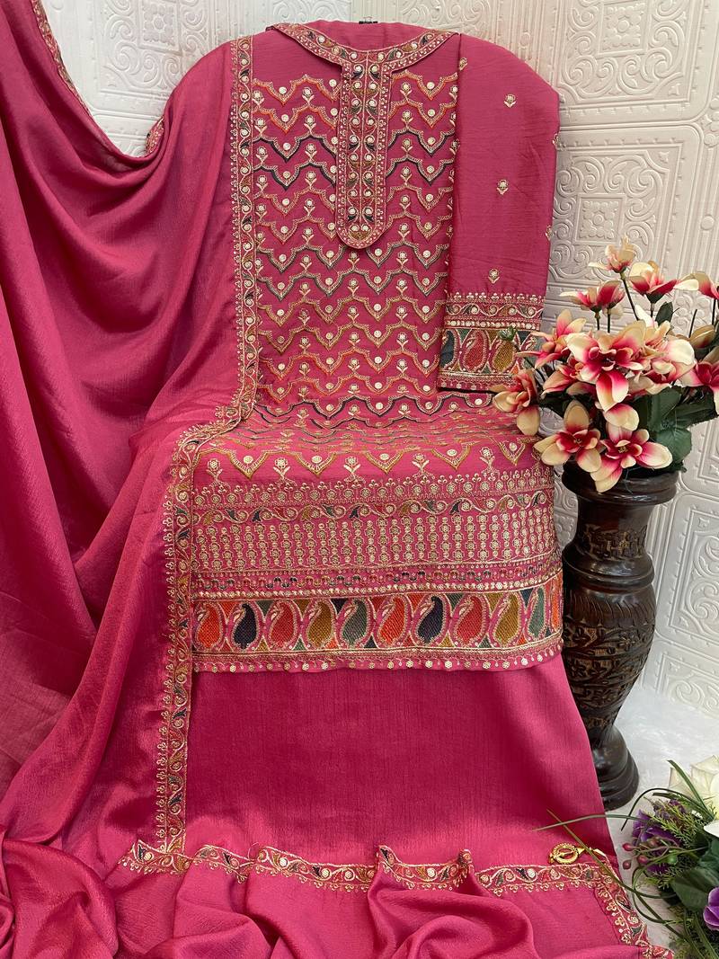 Maroon embroidered chinon salwar suit semi stitched