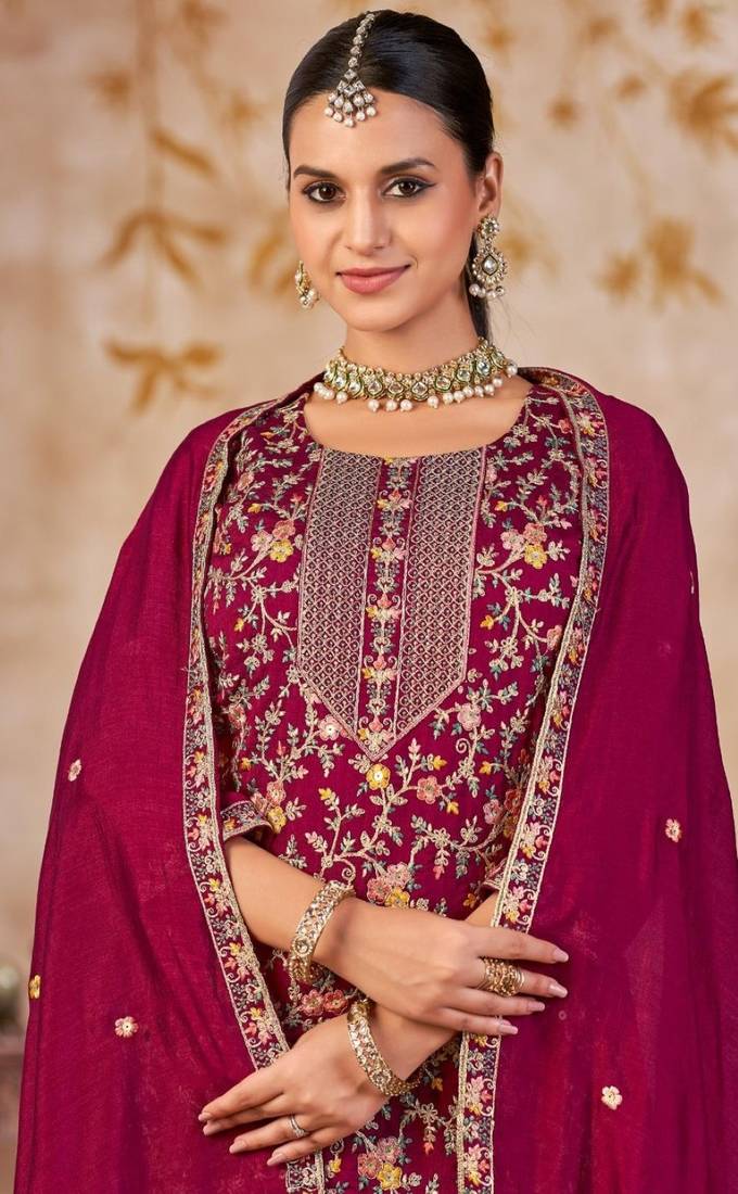 | Product Name | Maroon Vichitra Silk Readymade Plazzo Suit With Embroidery & Lace Work | |