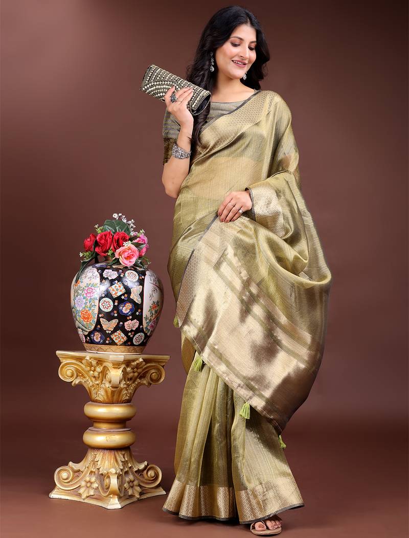 Mhendi green organza with thread work and zari weaving saree with blouse
