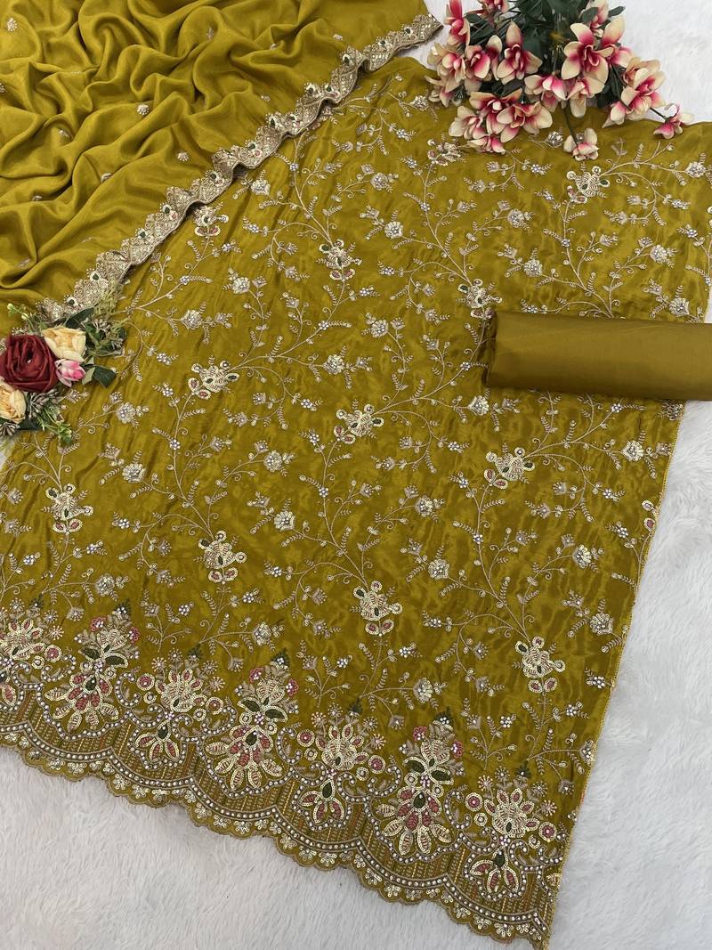 Mustard embroderied silk semi-stitched salwar suit semi stitched