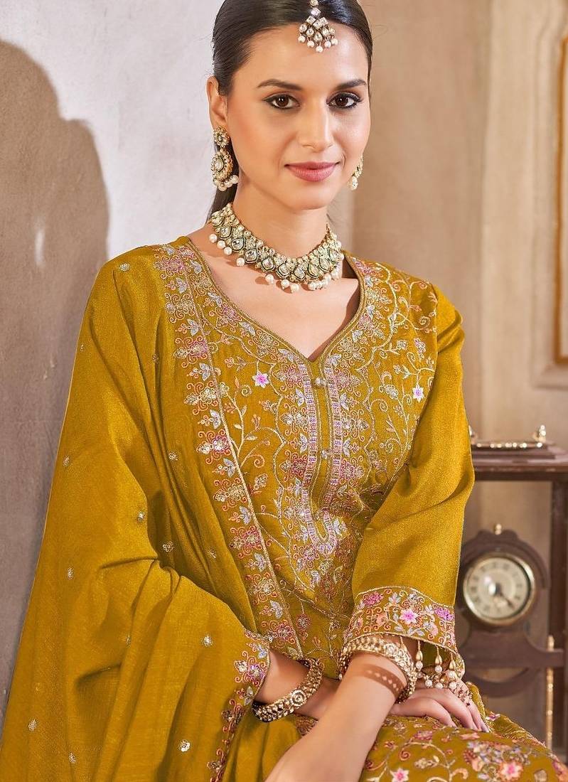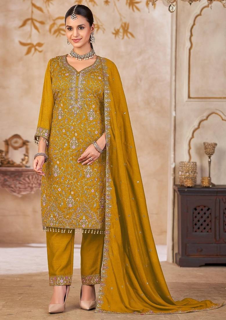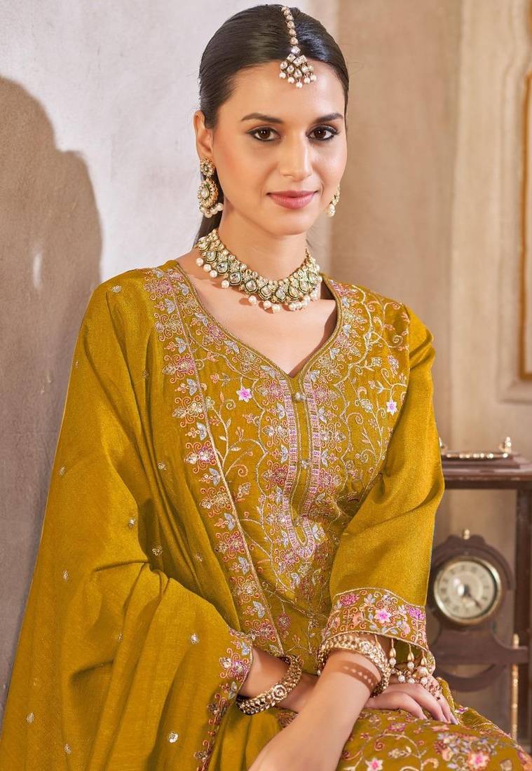 | Product Name | Mustard Vichitra Silk Readymade Suit With Embroidery & Lace Work | |