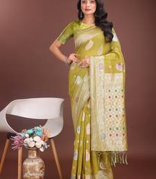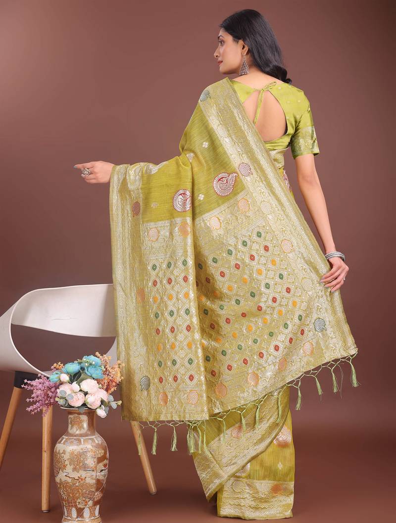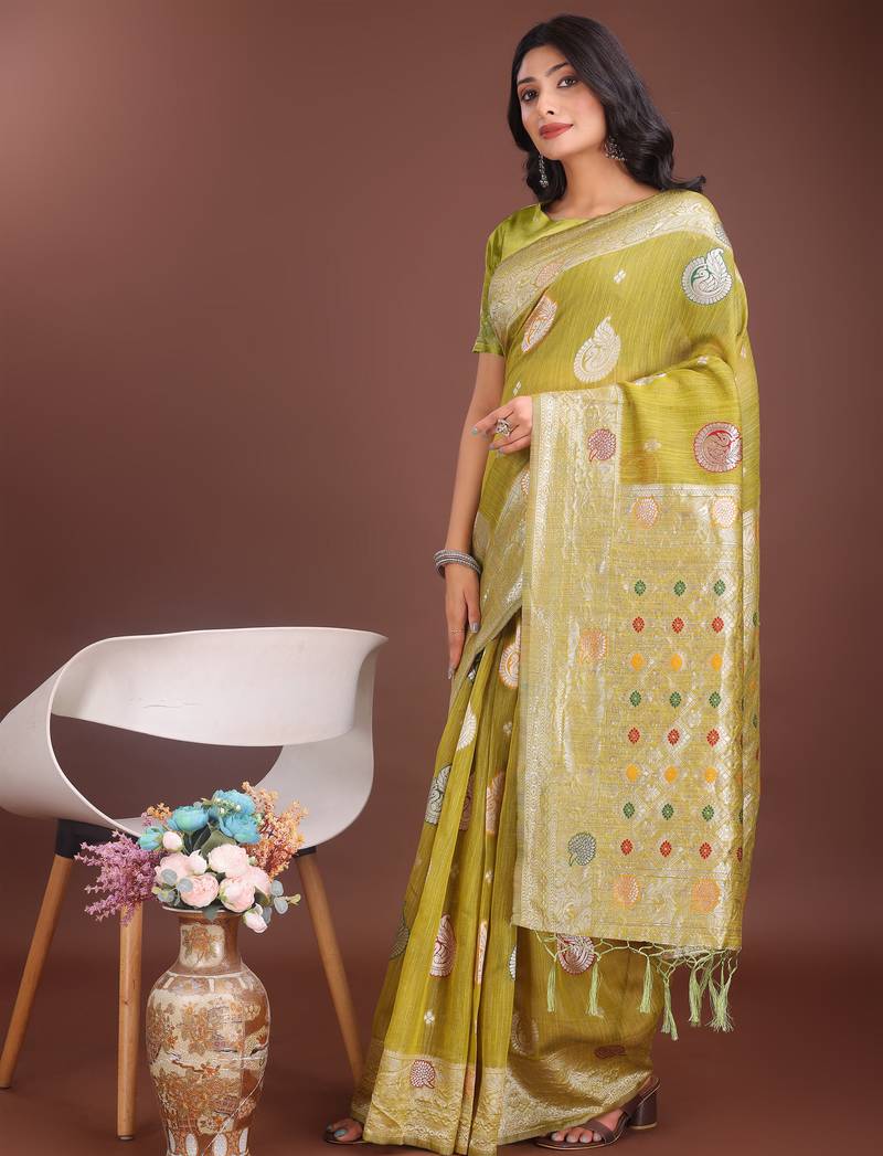 Product Name Mustrad Linen Cotton With Jacquard Work And Zari Weaving Saree With Blouse