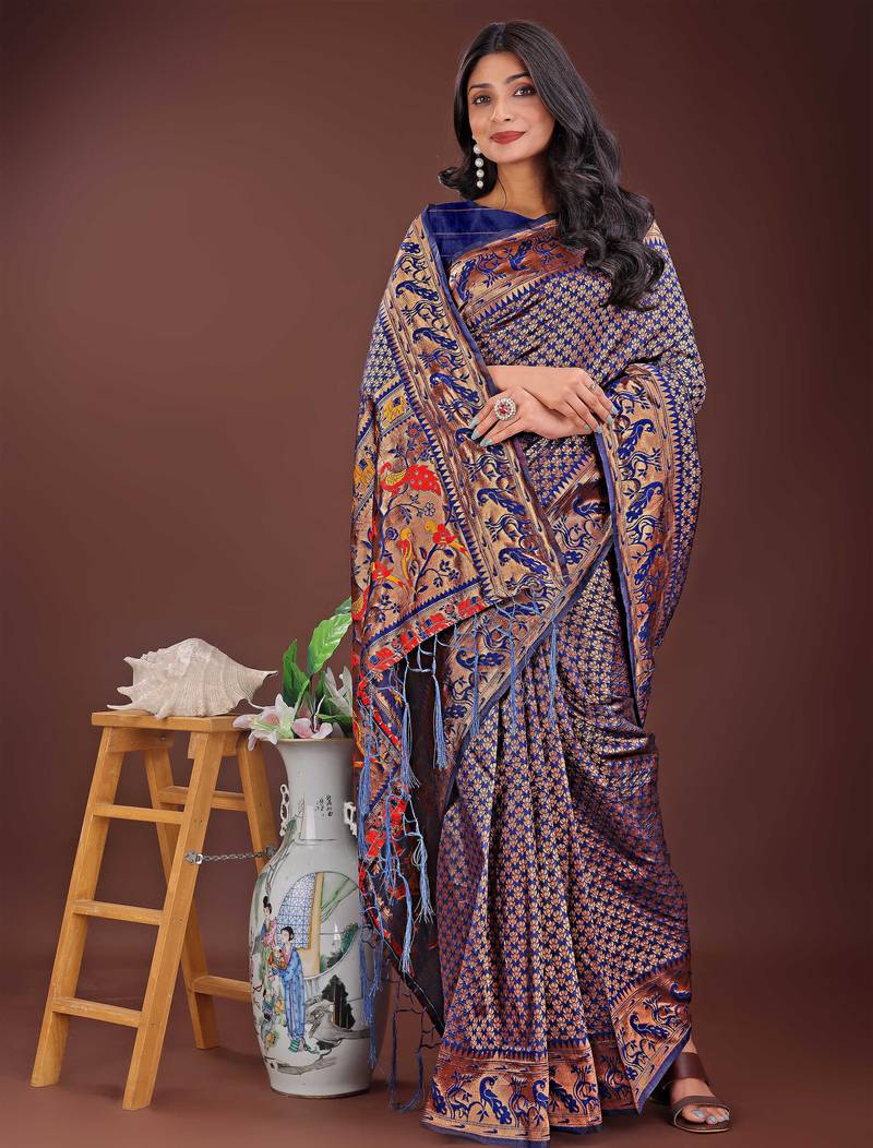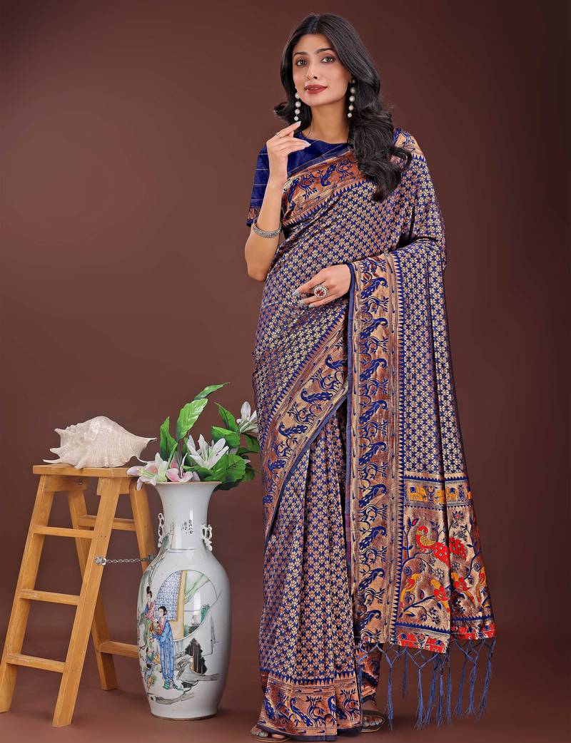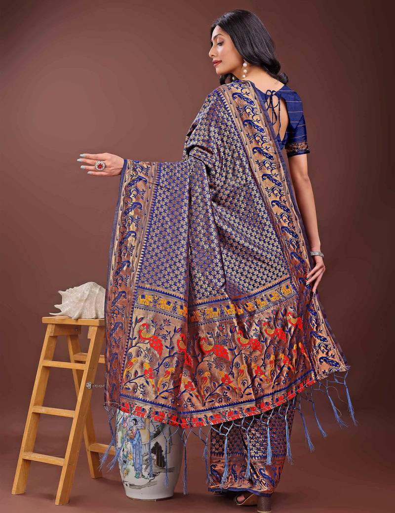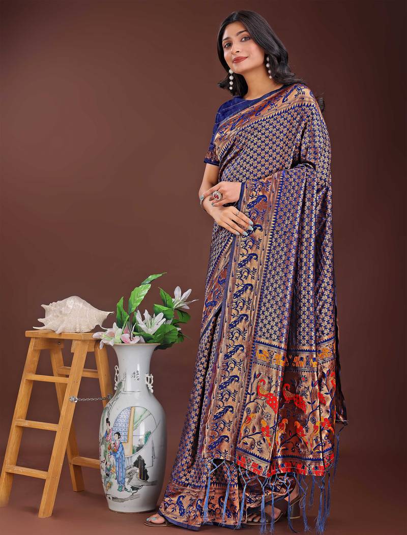 Navy blue art silk fabric with jacquard work and zari weaving saree with blouse