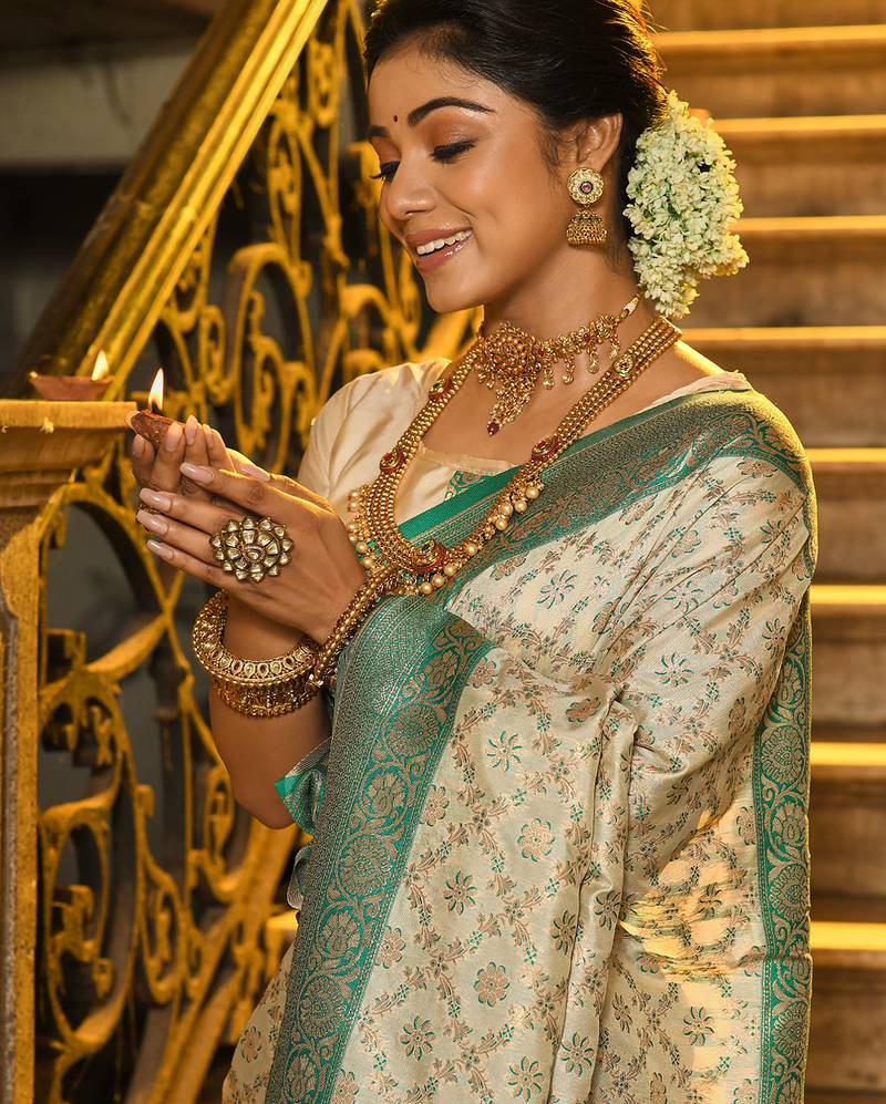 | • | Saree | : | Color- Off White / Fabric- Banarasi Silk |