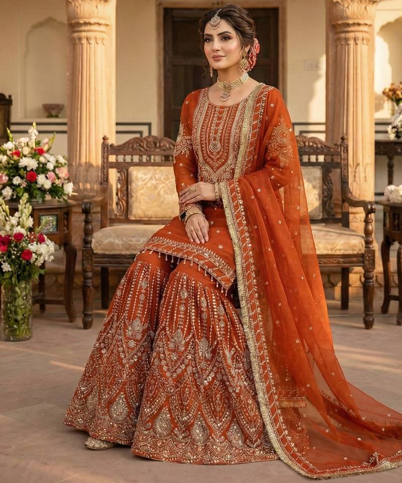 | Product Name | Orange Georgette Suit With Embroidery & Sequin Work | |