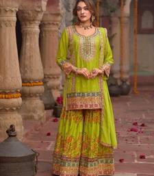 Parrot-green chinon readymade palazzo suit with codding dori & sequence work - full stitched free size