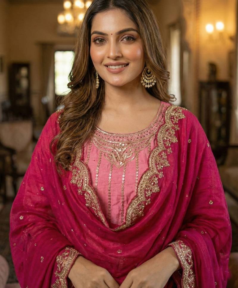 | Product Name | Pink Chinon Suit With Embroidery & Sequin Work | |