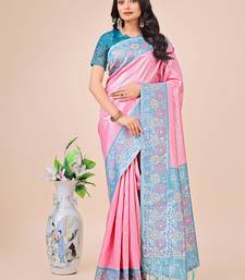 Pink lichi art silk with printed and zari weaving saree with blouse