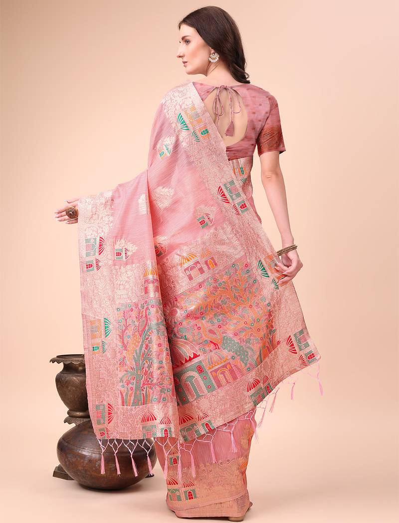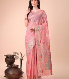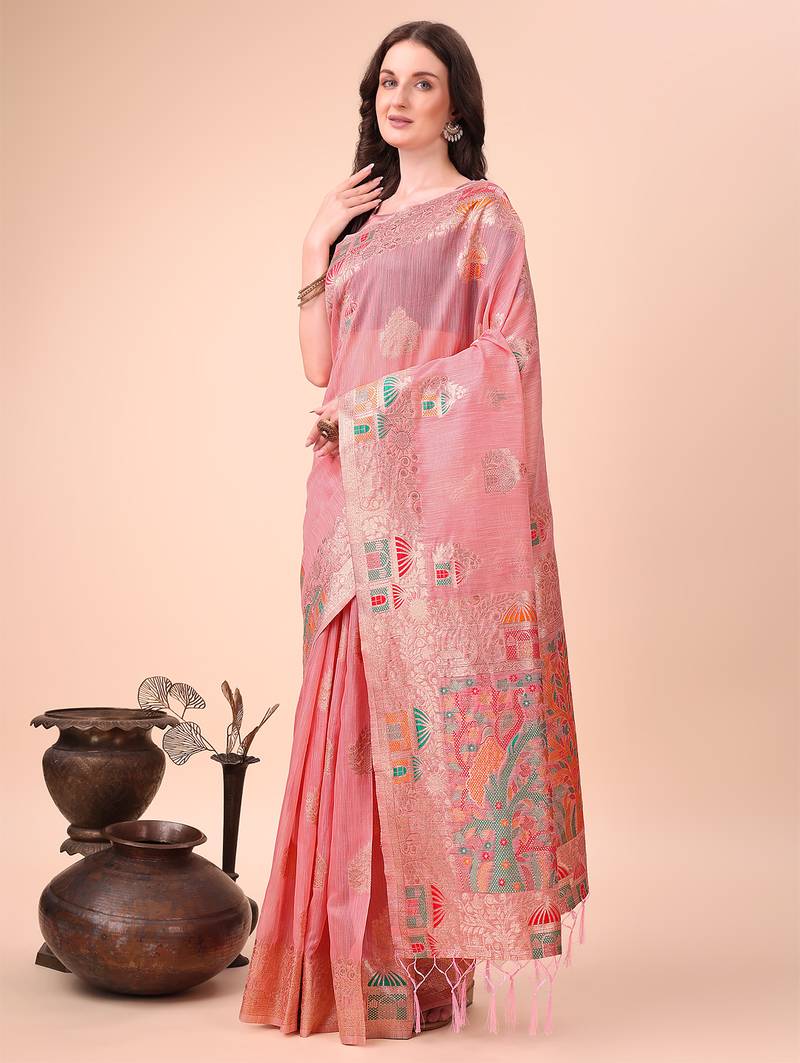 | Product Name | Pink Linen Cotton With Jacquard Work And Zari Weaving Saree With Blouse | |