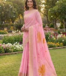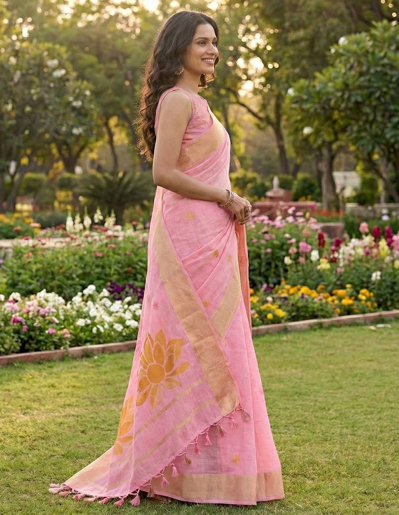 Pink linen saree with blouse piece