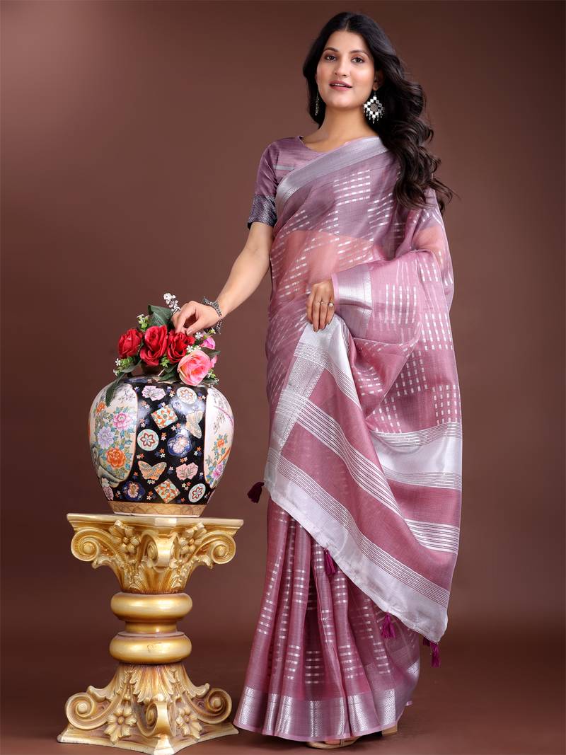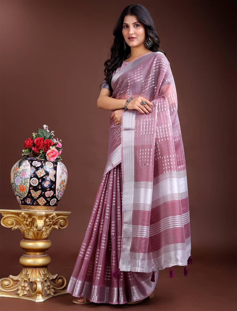 | Product Name | Purple Organza With Thread Work And Zari Weaving Saree With Blouse | |