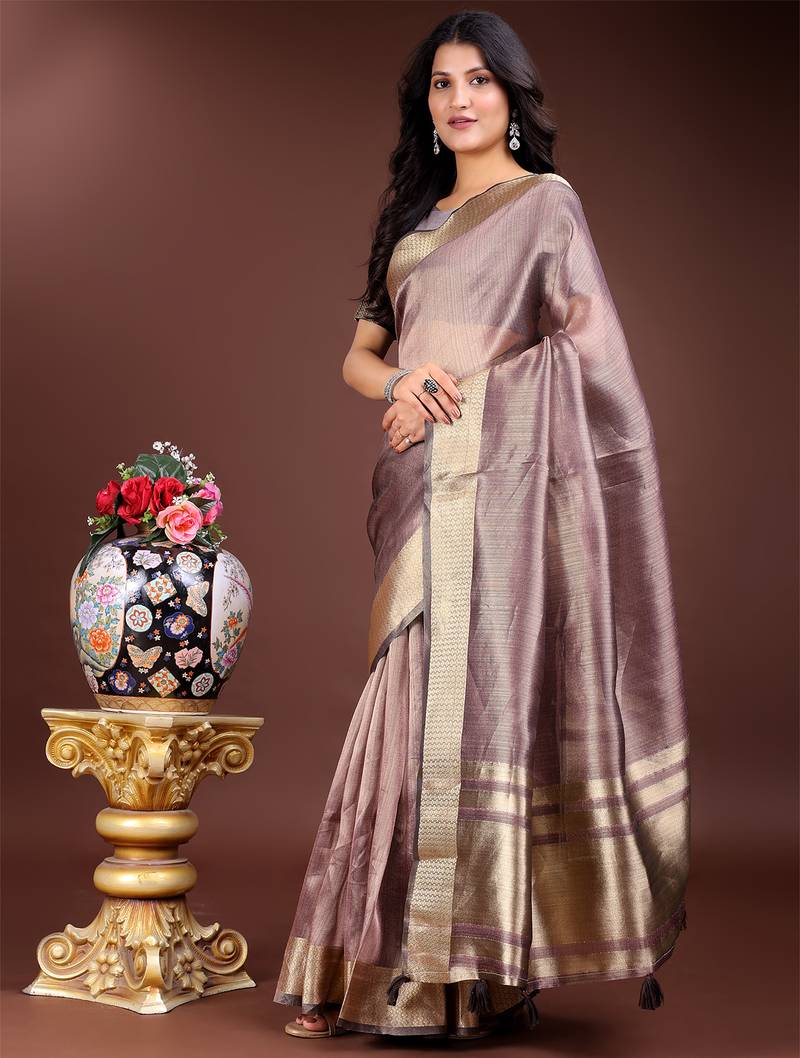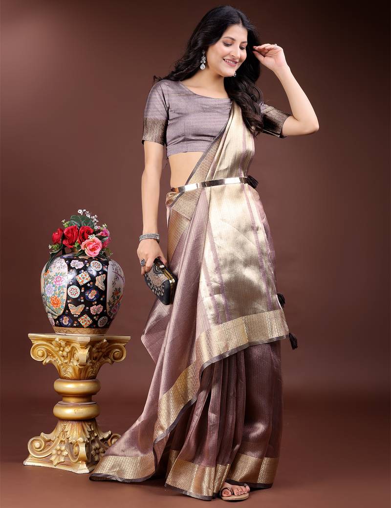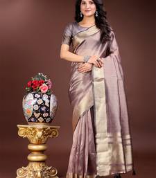 Purple organza with thread work and zari weaving saree with blouse