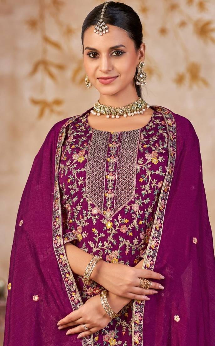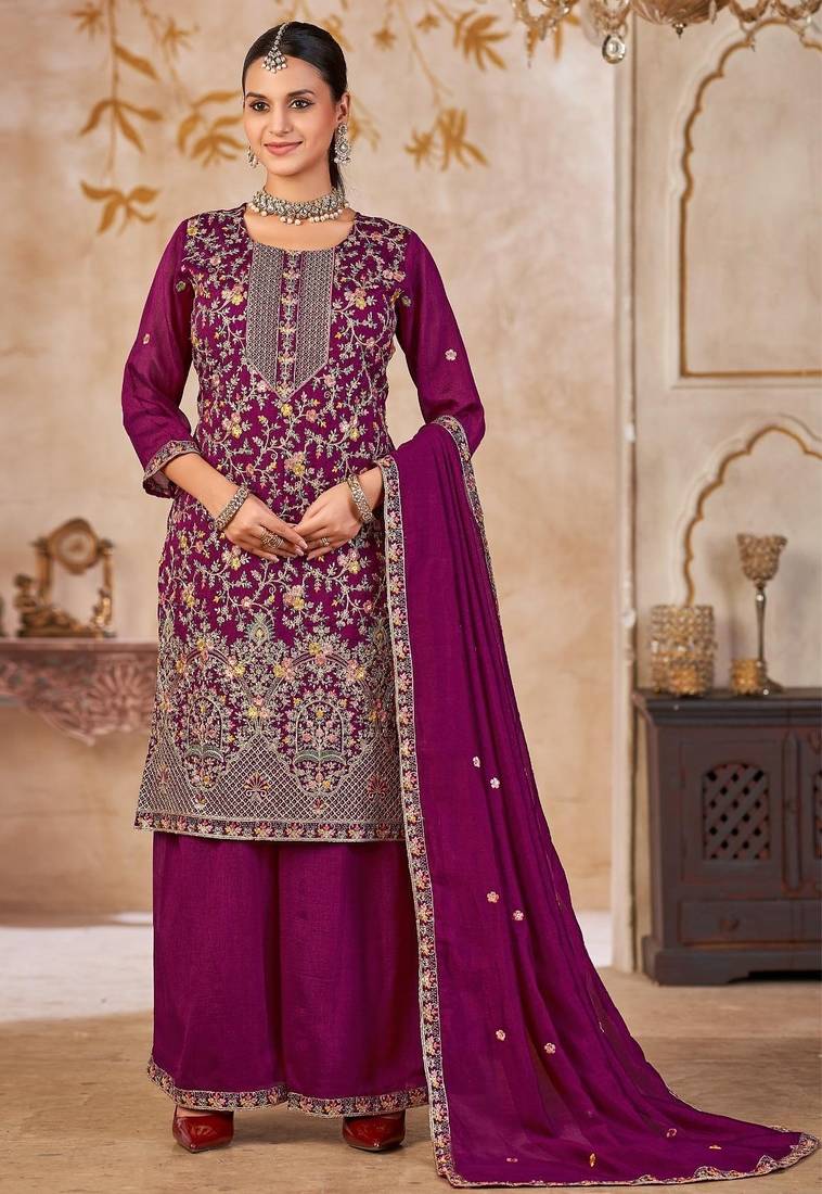 Purple vichitra silk readymade plazzo suit with embroidery & lace work stitched
