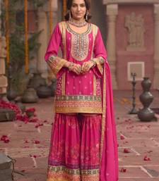 Product Name Rani Pink Chinon Readymade Palazzo Suit With Codding Dori & Sequence Work Full Stitched Free Size