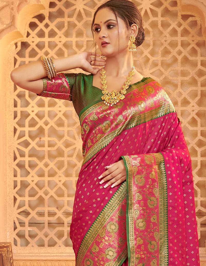 | • | Saree | : | Color- Rani Pink / Fabric- Art Silk |