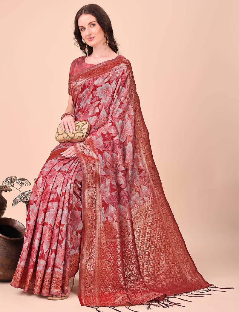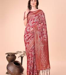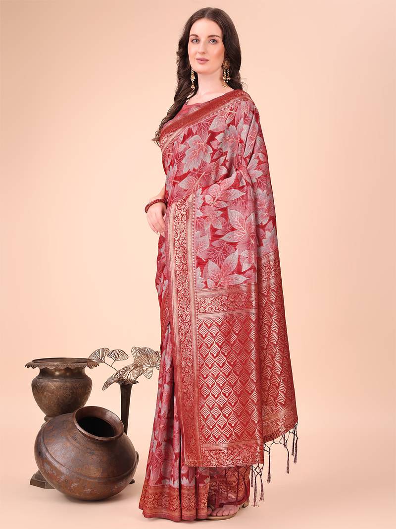 red cotton fabric with with jacquard work and zari weaving saree with blouse