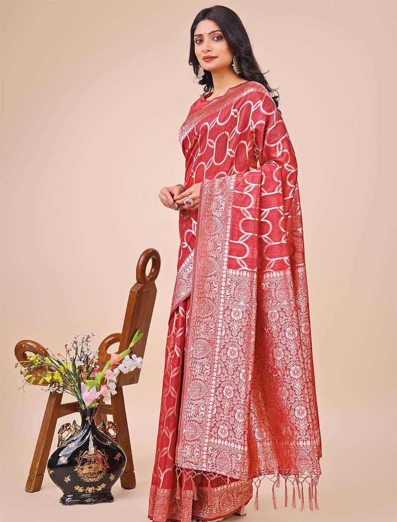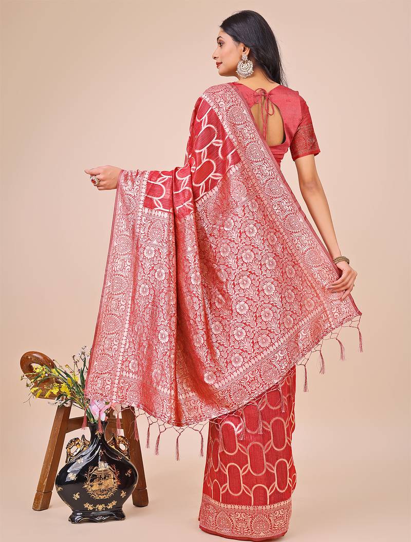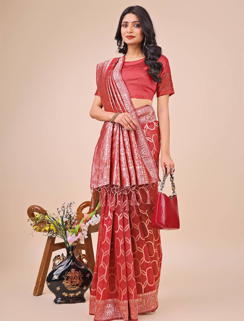 | Product Name | Red Linen Cotton With Jacquard Work And Zari Weaving Saree With Blouse | |