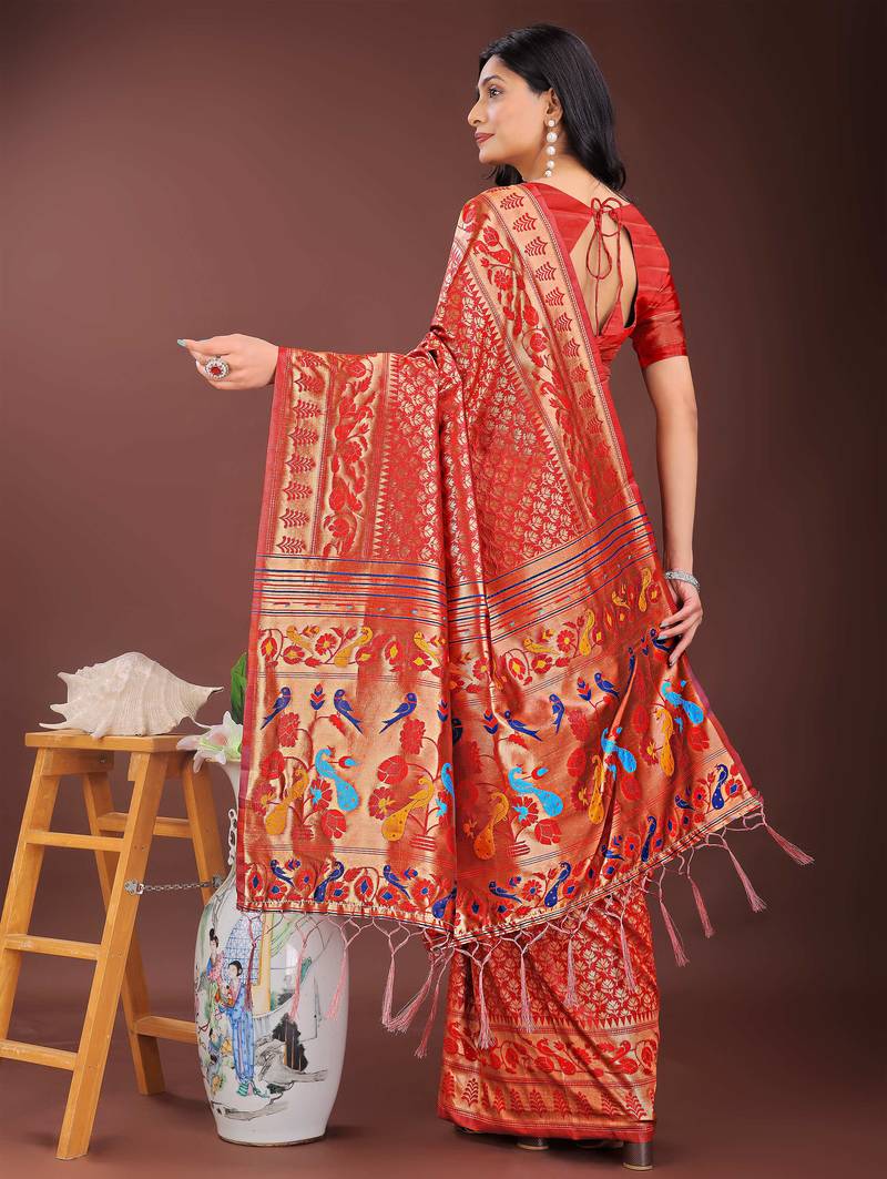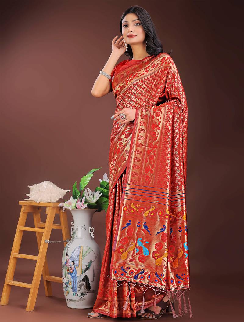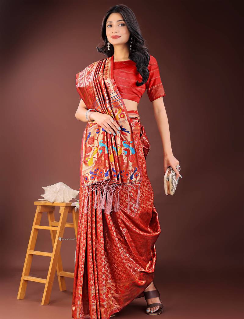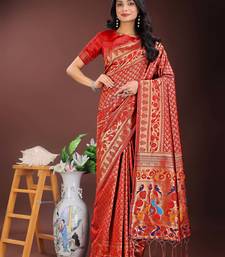 Red art silk fabric with jacquard work and zari weaving saree with blouse