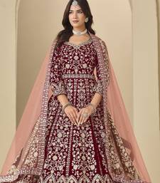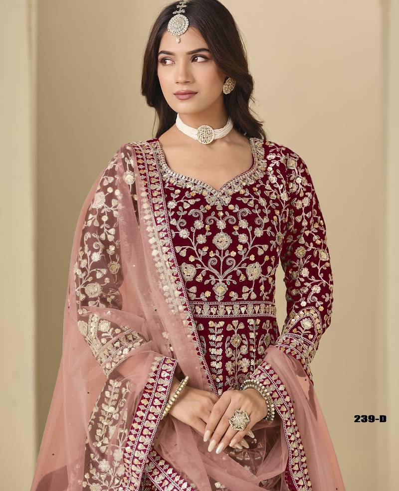 Red velvet semi stitched anarkali suits with heavy embroidery work