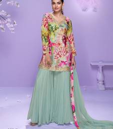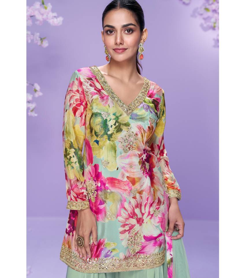 | Product Name | Sea Green Chinon Readymade Plazzo Suit With Digital Embroidery Work Free Size Stitched | |