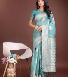 Sea green linen cotton with jacquard work and zari weaving saree with blouse