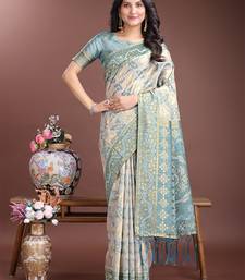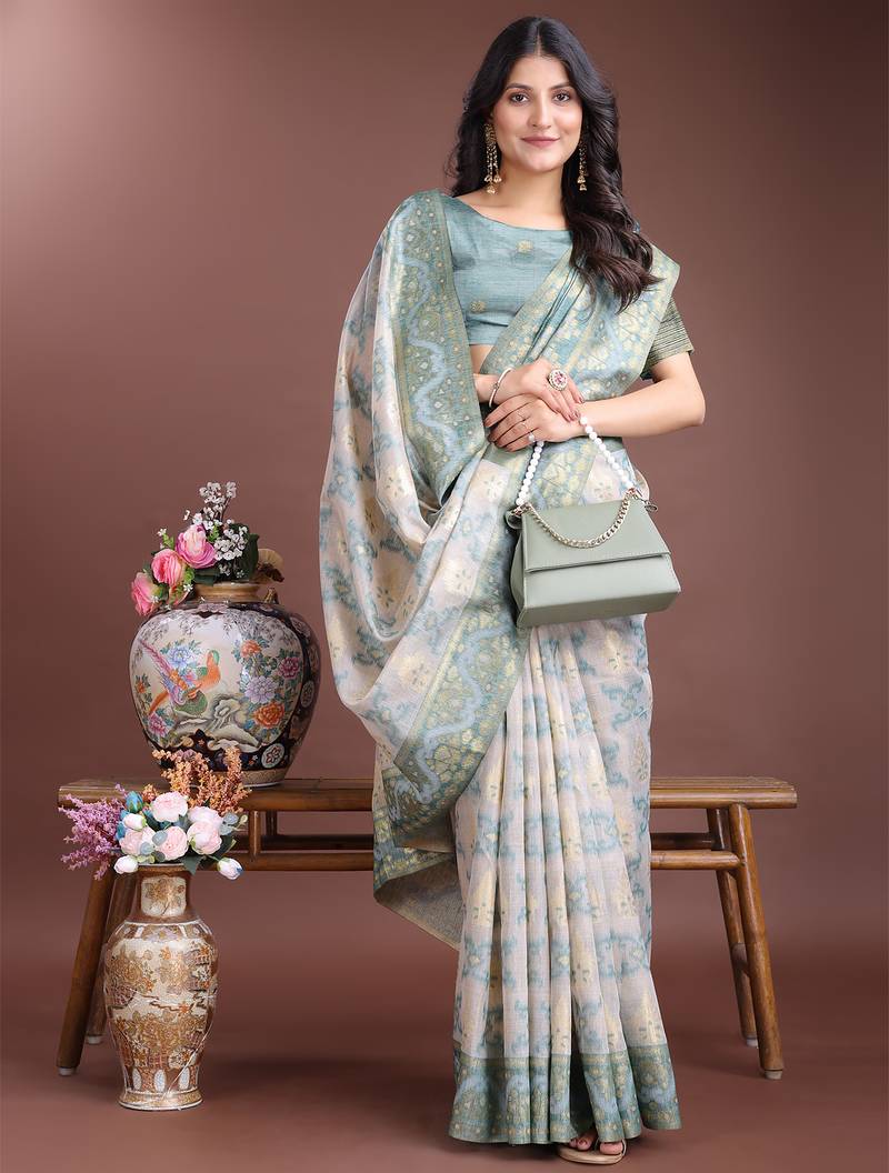 Sea green linen cotton with printed and zari weaving saree with blouse