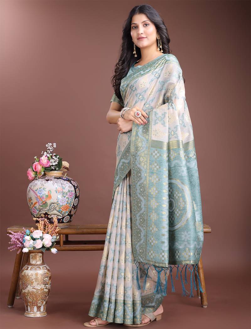 | Product Name | Sea Green Linen Cotton With Printed And Zari Weaving Saree With Blouse | |