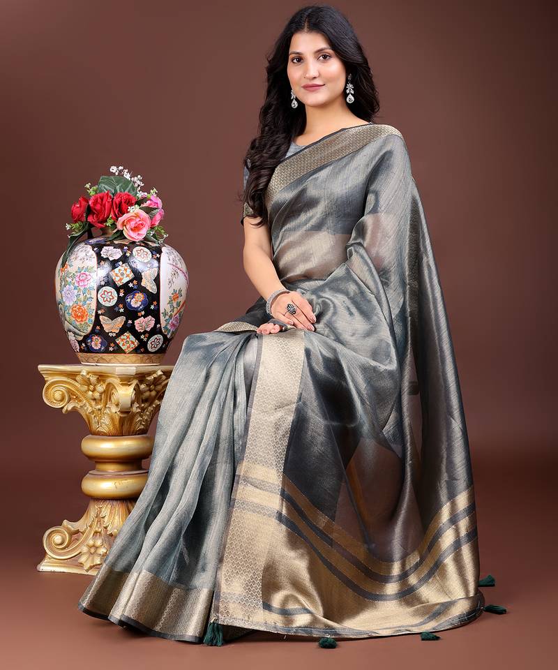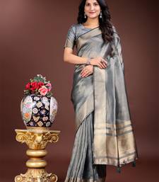 Silver organza with thread work and zari weaving saree with blouse