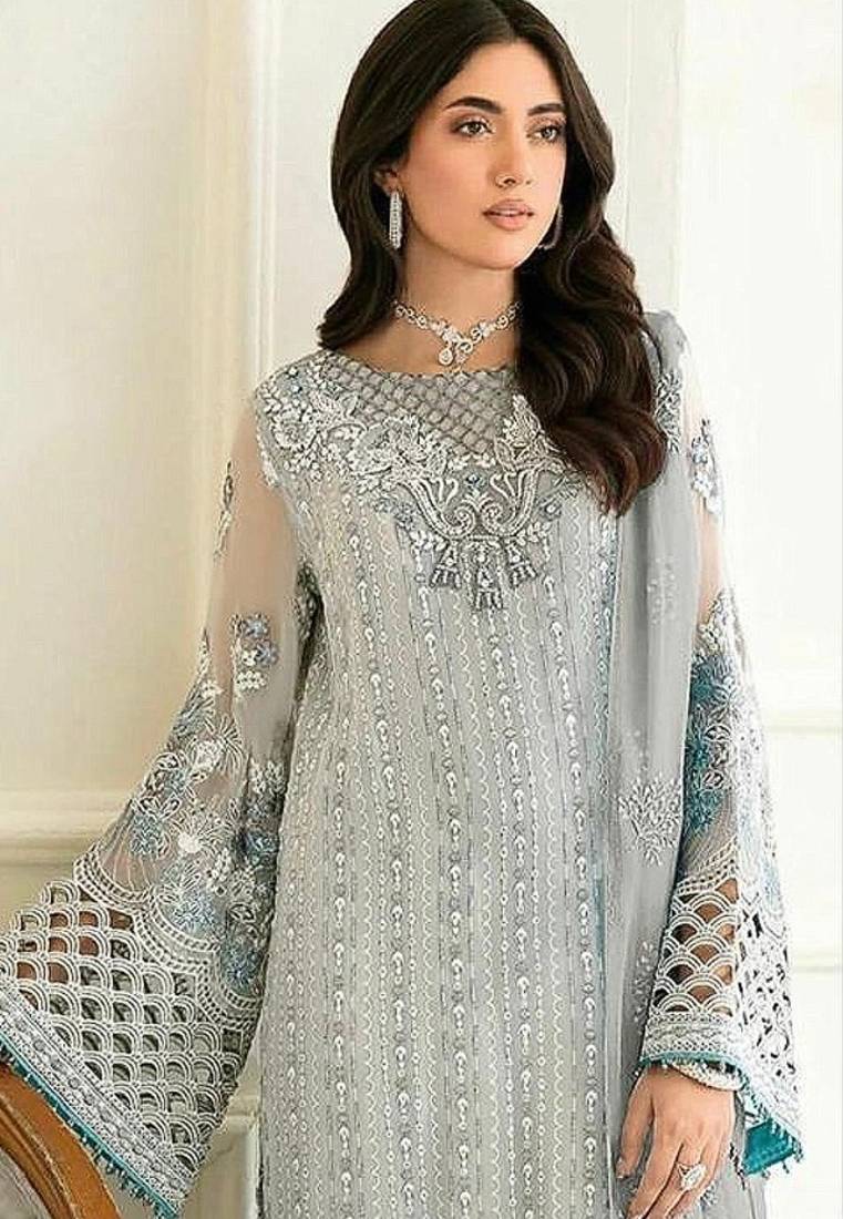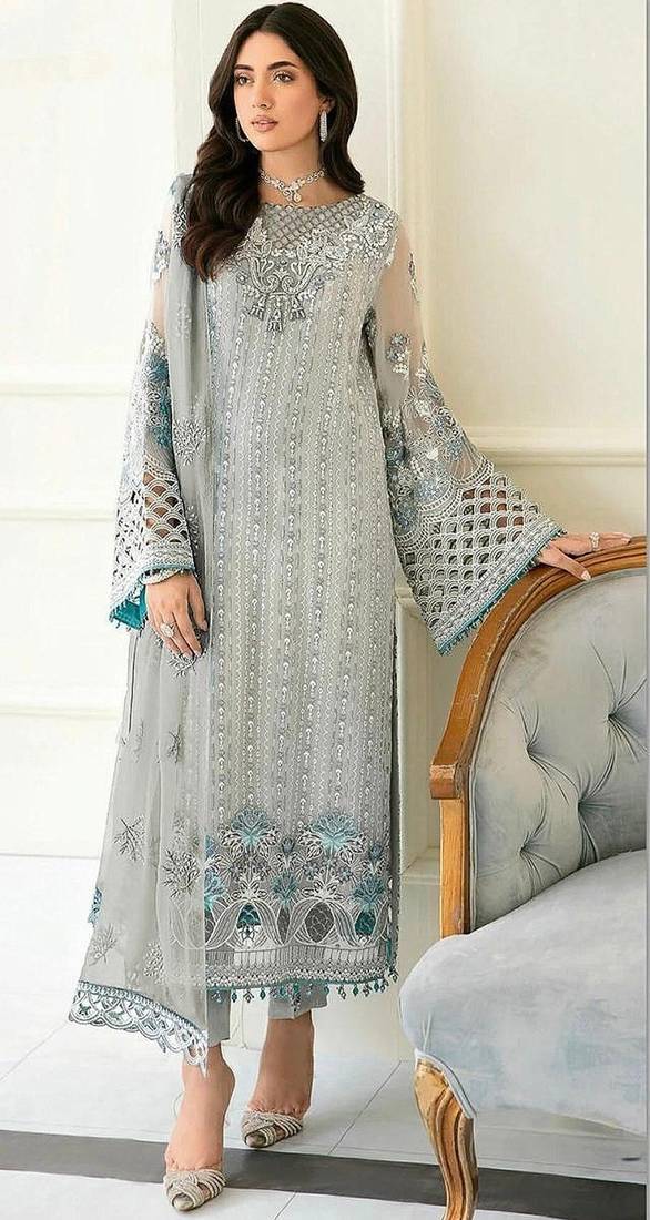 Product Name | Sky Blue Fox Georgette Semi Stitched Suit With Embroidery Sequence Work & Khatli Work | |