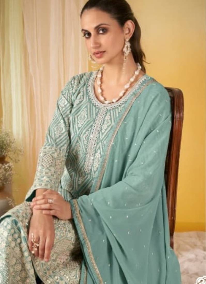 Sky blue georgette free size stitched suit with embroidery & sequence work