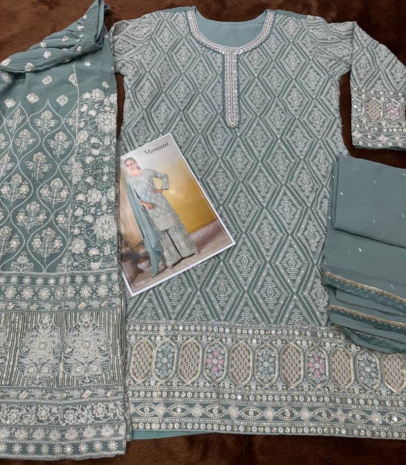 | Product Name | Sky Blue Georgette Free Size Stitched Suit With Embroidery & Sequence Work | |