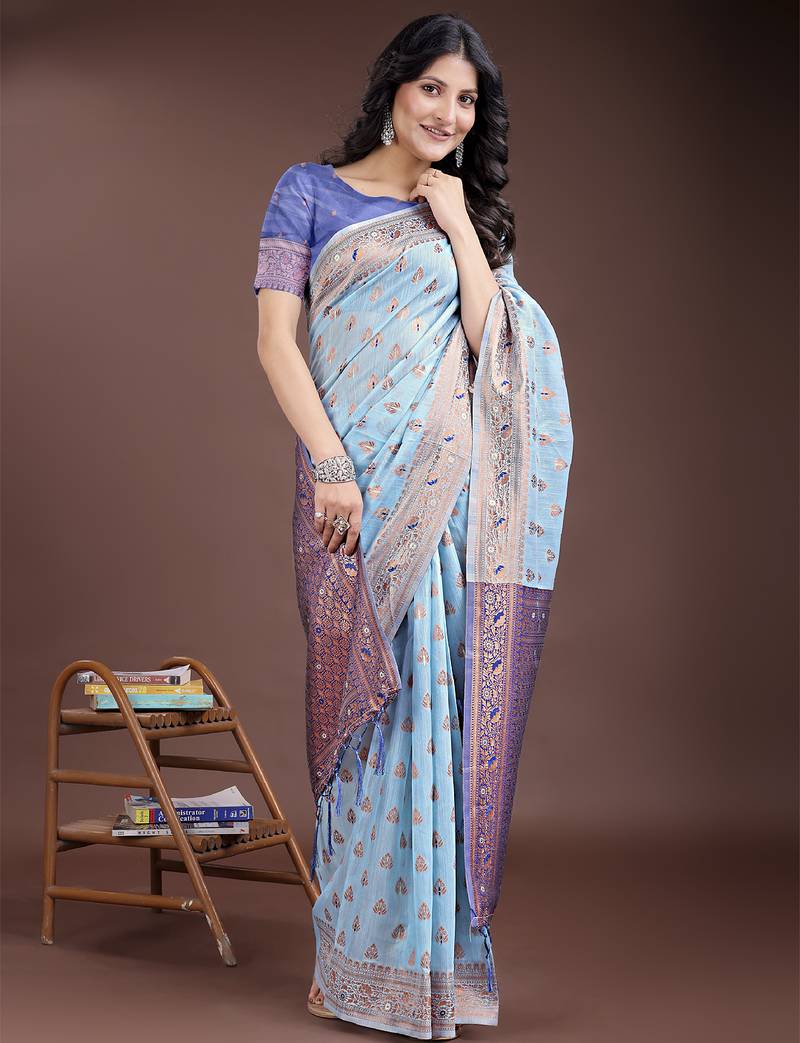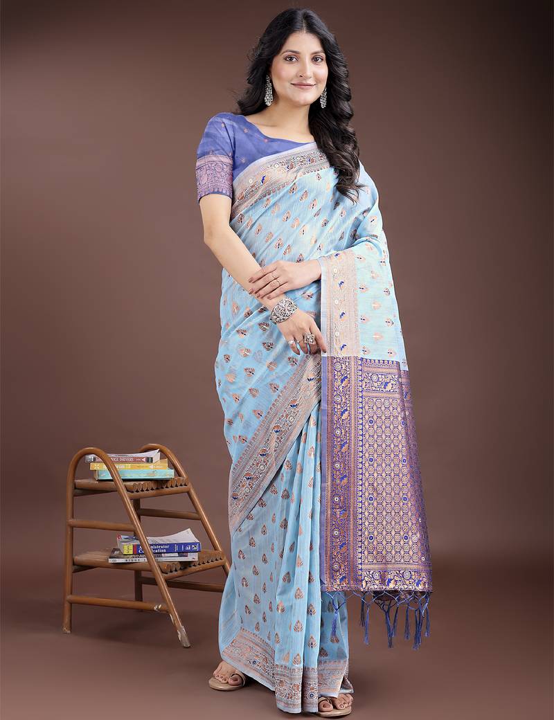 Product Name Sky Blue Linen Cotton With Jacquard Work And Zari Weaving Saree With Blouse