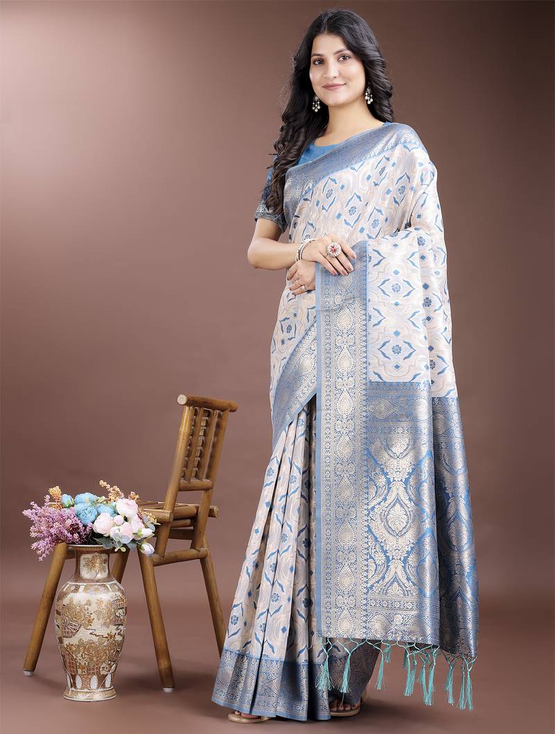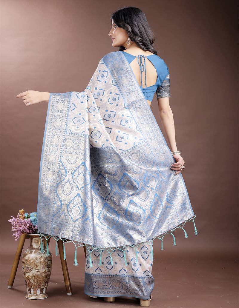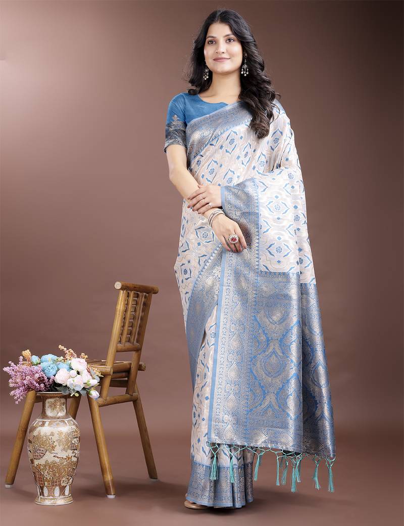 | Product Name | Sky Blue Linen Cotton With Jacquard Work And Zari Weaving Saree With Blouse | |