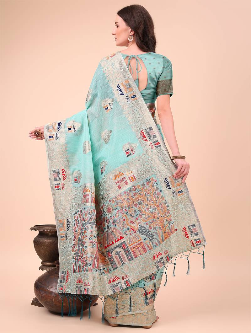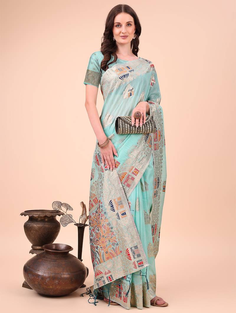 | Product Name | Sky Blue Linen Cotton With Jacquard Work And Zari Weaving Saree With Blouse | |