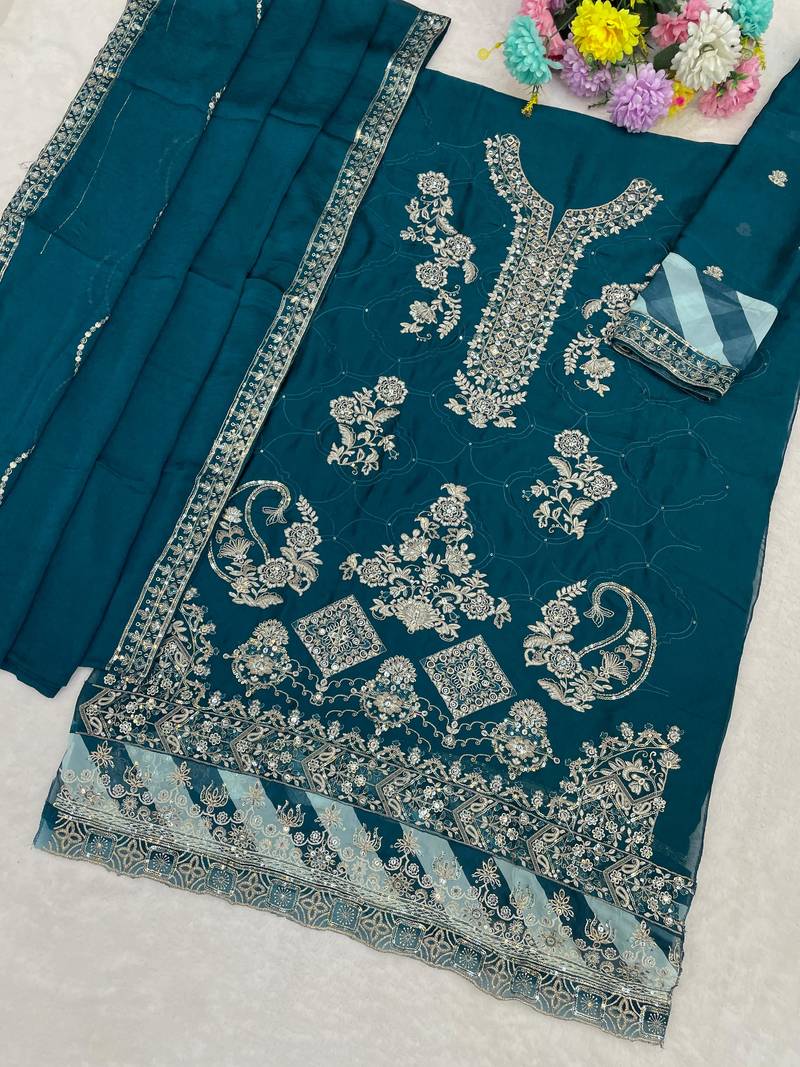 Teal blue rangoli silk suit with embroidery & sequin work semi stitched