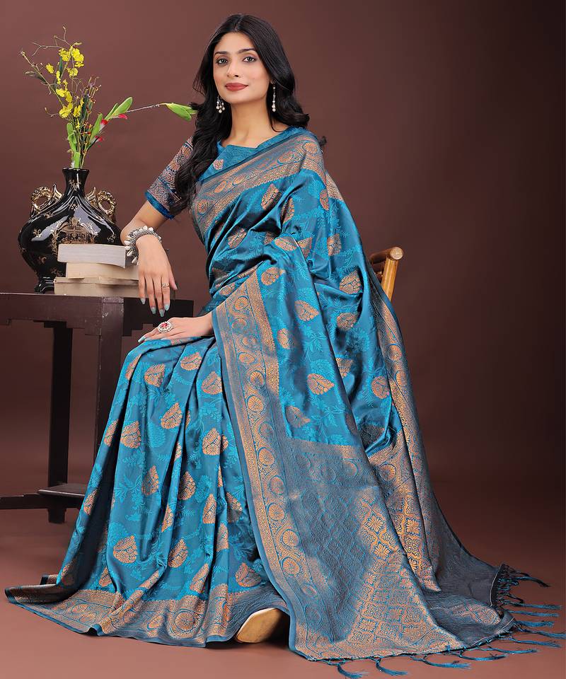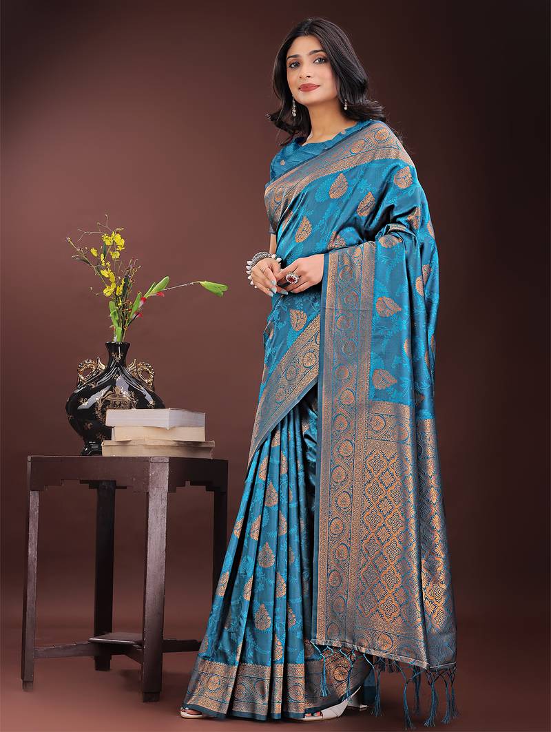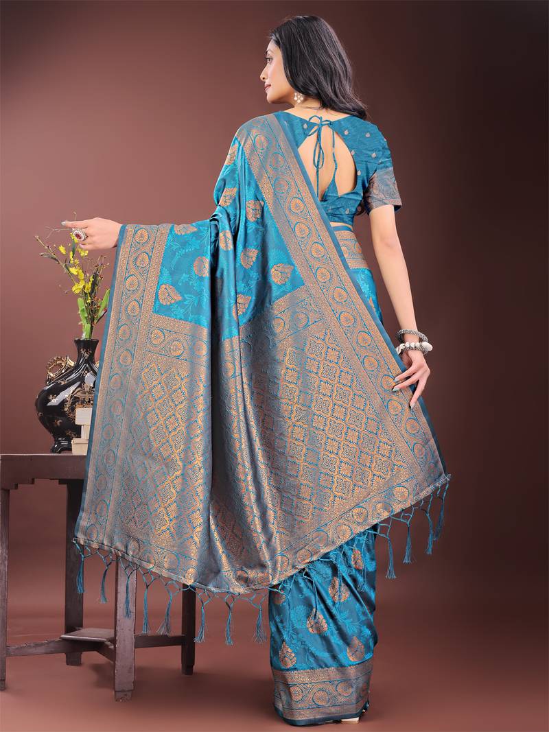 Teal art silk fabric with jacquard work and zari weaving saree with blouse