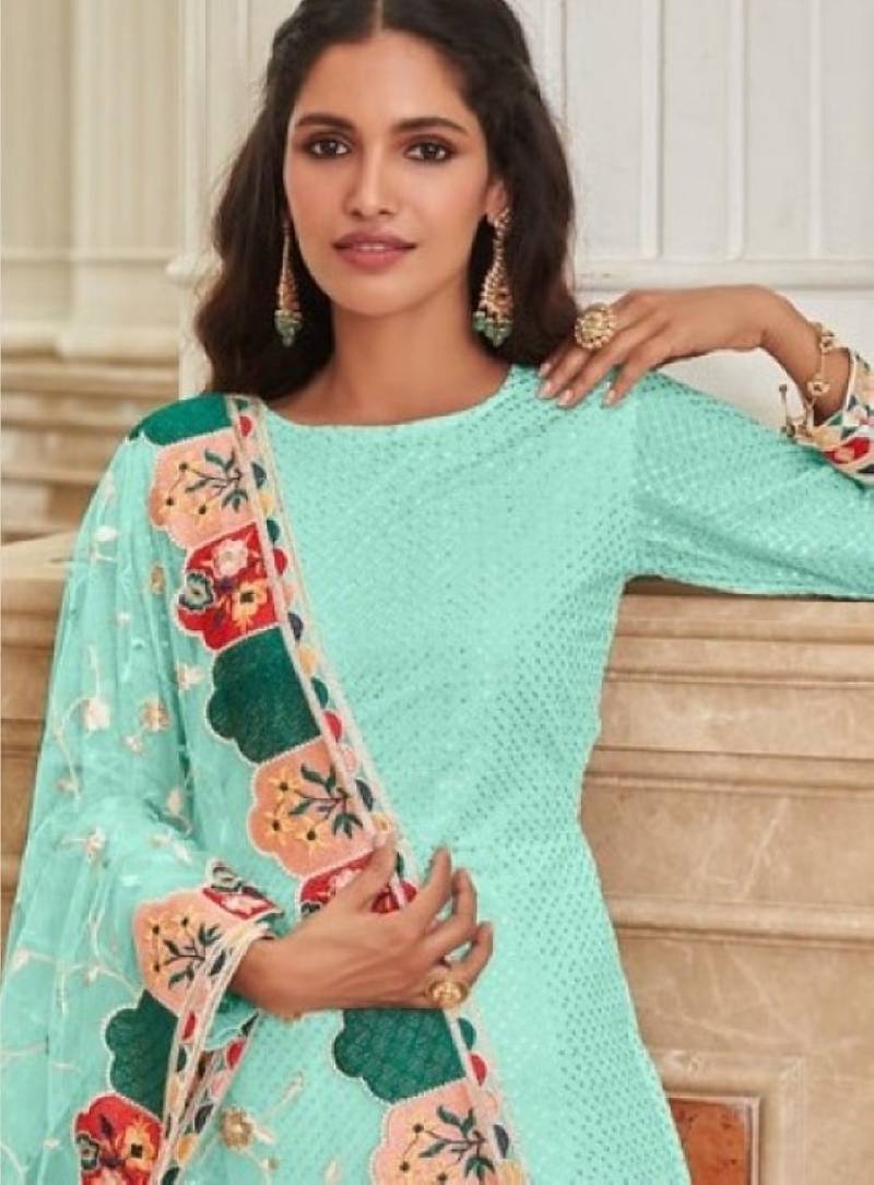 Turquoise faux georgette embroidered sequins & mirror work palazzo suit semi stitched