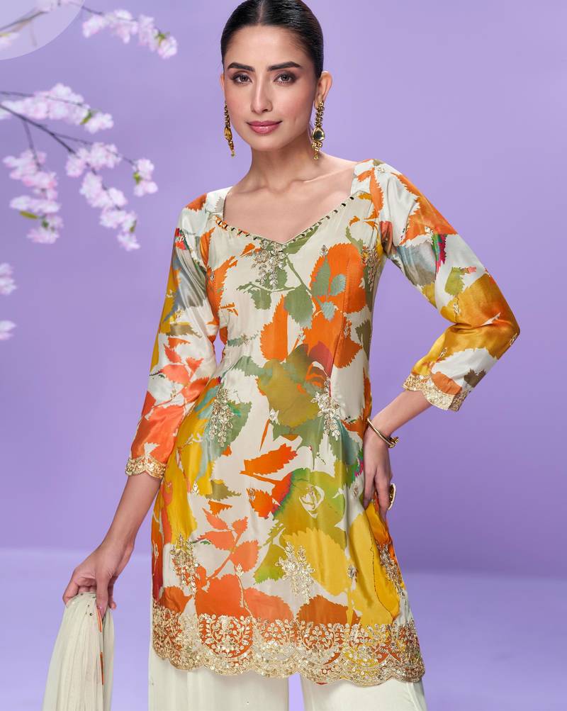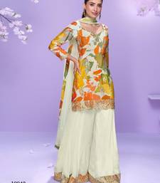 | Product Name | White Chinon Readymade Plazzo Suit With Digital Embroidery Work Free Size Stitched | |