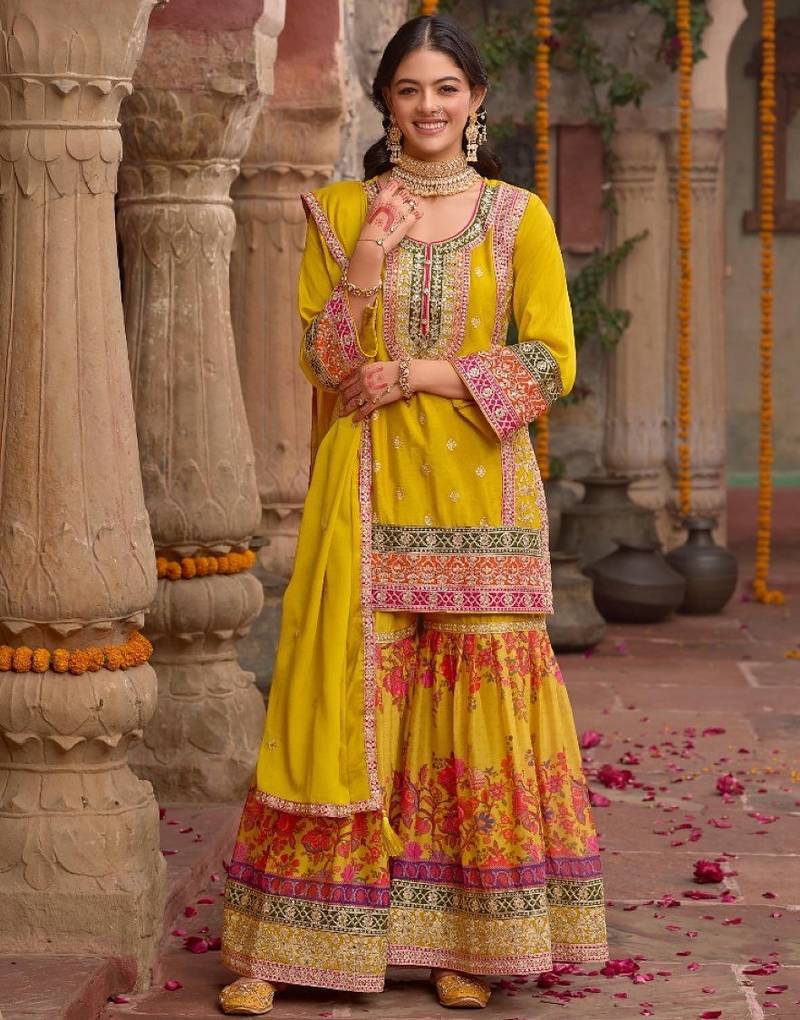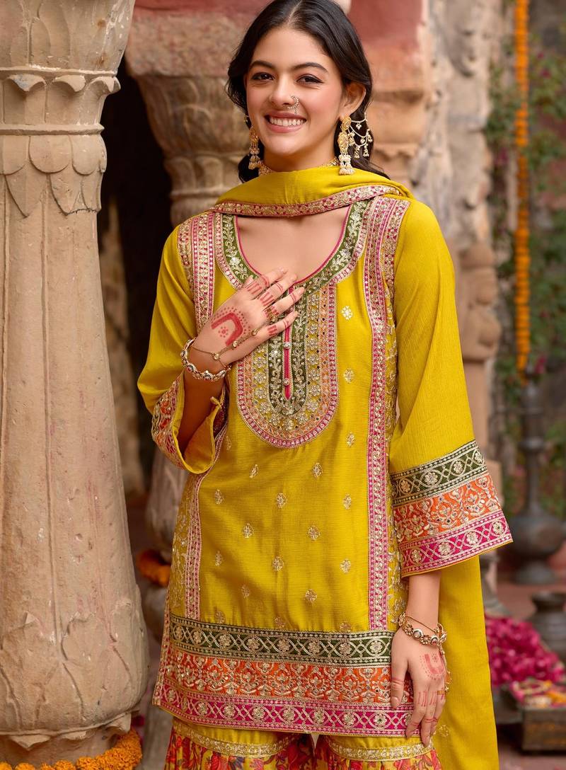 | Product Name | Yellow Chinon Readymade Palazzo Suit With Codding Dori & Sequence Work Full Stitched Free Size | |