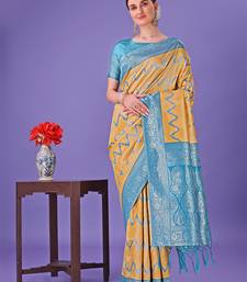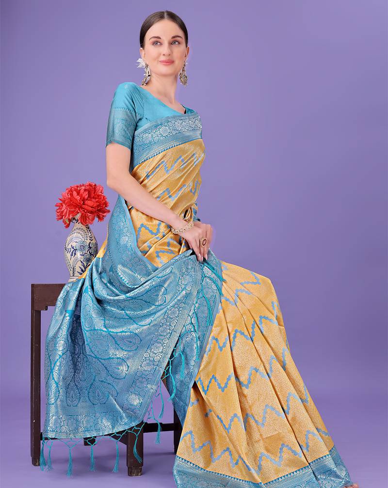 Yellow lichi art silk with printed and zari weaving saree with blouse