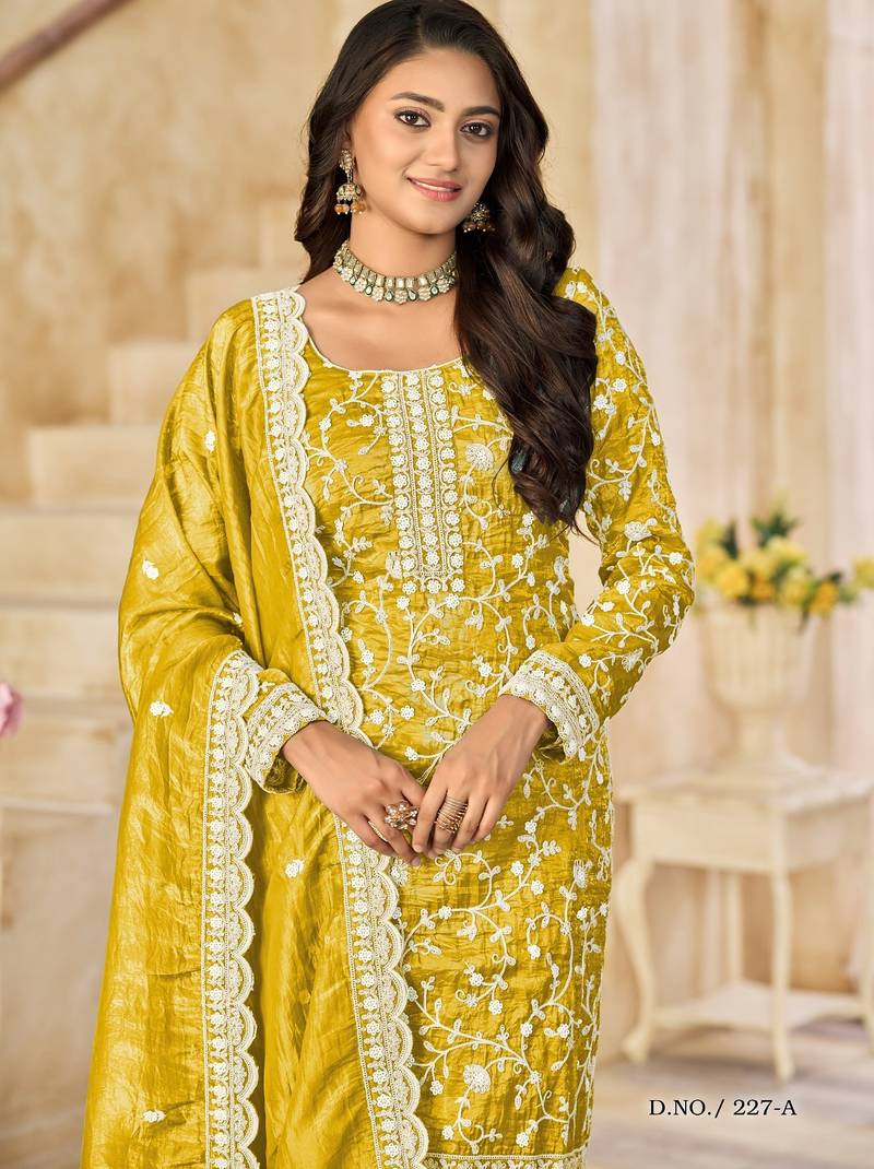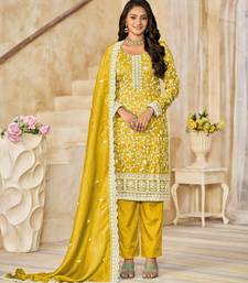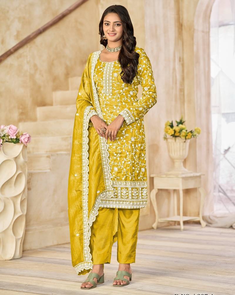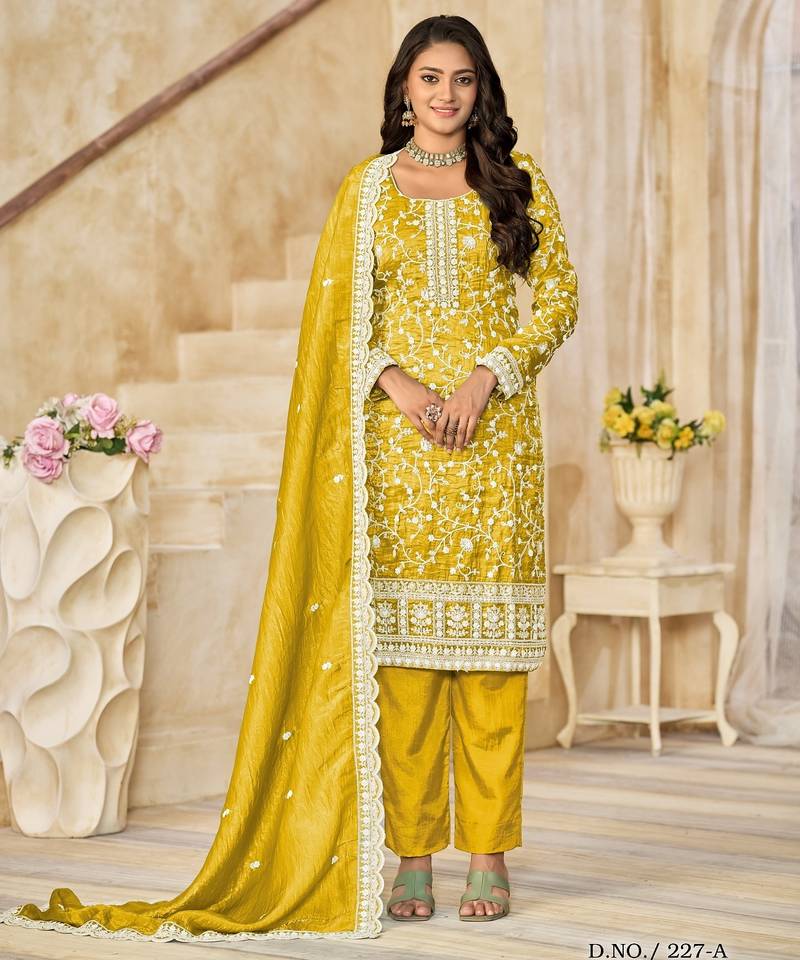 | Product Name | Yellow Organza Crush Semi Stitched Suit With Embroidery Work | |