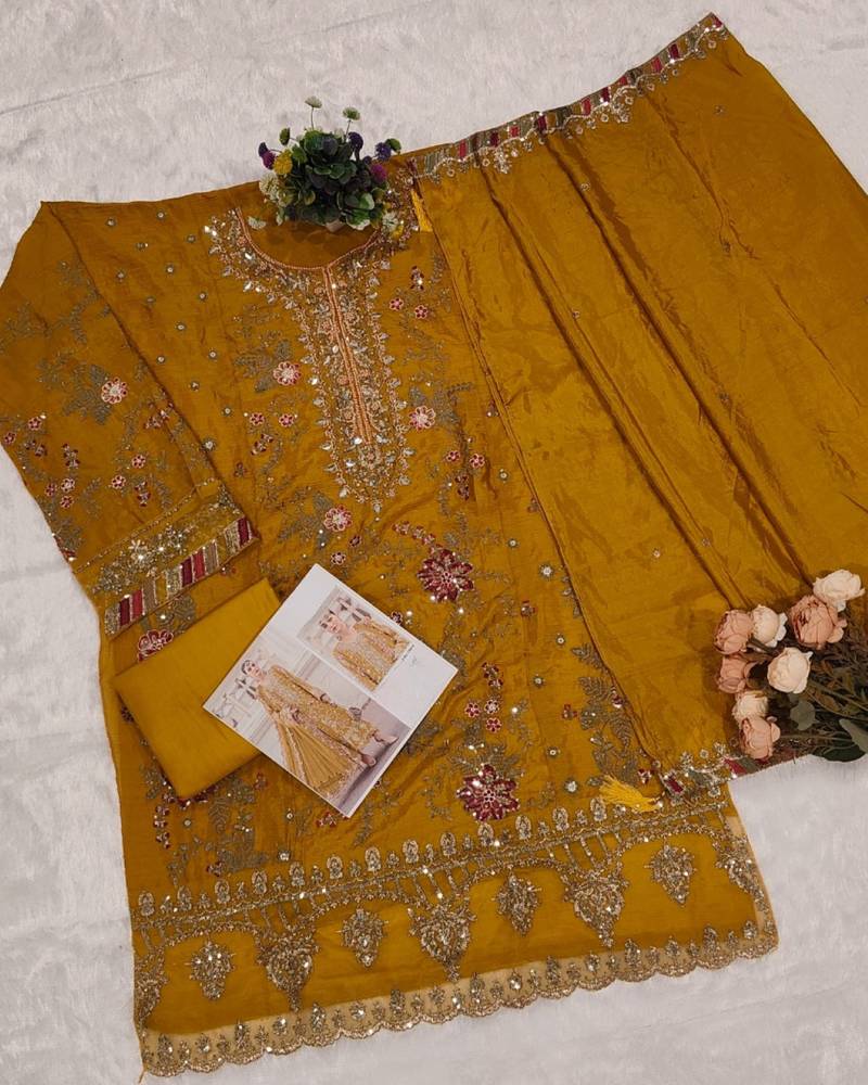 Yellow silk suit with embroidery & sequin work semi stitched