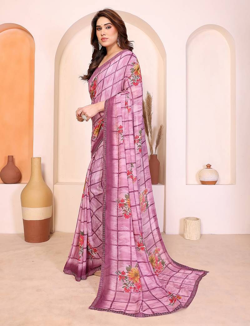 purple floral georgette saree with lace border & blouse piece